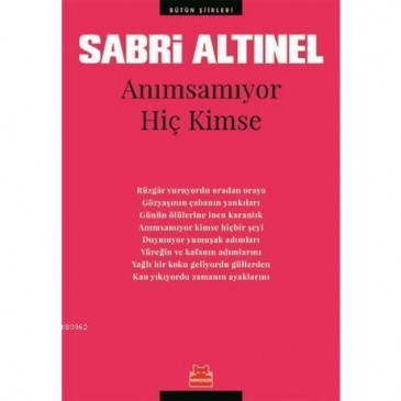 1940 Kuşağı toplumcu şairleri arasında titizliğiyle dikkat çeker Sabri Altınel (1925-1985).Bir o kadar, Türk şiirinde akımların, toplulukların içine dahil edilemeyecek poetikasıyla kendi yolunu çizen, biricik şiirini inşa eden "yalnız ustalar" arasında ilk akla gelen isimlerden. Şair, çevirmen, öğretmen Altınel`in yaşamında yayımladığı tüm şiirleri Anımsamıyor Hiç Kimse`de bir araya geliyor.Kimi şiirlerin el yazısı ve daktilo edilmiş nüshalarını da barındıran elinizdeki kitap, "Şiir bir yaşama anlayışıdır. Şairin düşüncelerinin, bilgilerinin, sezgilerinin toplamıdır..." diyen Altınel`in titizliğini ve şiir yazma sürecini de ortaya koyuyor.
