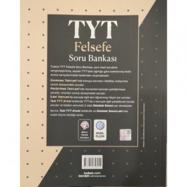 Tudem TYT Felsefe Soru Bankasi, yeni nesil sorularla zenginlestirilmis, sayilari TYT’deki agirliga göre belirlenmis farkli zorluk seviyelerindeki testlerden olusmaktadir: