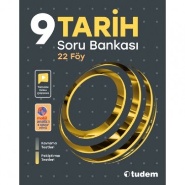 Tudem 9. sınıf Tarih Soru Bankası’nda beceri temelli yeni nesil sorularla zenginleştirilmiş ve farklı zorluk düzeylerindeki testlerden oluşan 8’i sınav föyü olmak üzere toplam 22 föy yer almaktadır.Her bir konu föyü, kavrama ve pekiştirme testlerinden oluşmaktadır:Kavrama Testleri’nde konuyu kavratıcı nitelikte kolay/orta zorluk düzeyinde sorular ve bu soruları çözmekte kılavuzluk edecek bilgi, dikkat ve ipucu kutuları; Pekiştirme Testleri’nde kavranılan konuları pekiştirmeye yönelik orta/ileri zorluk düzeyindeki sorular yer almaktadır.Sınav föyleri ise farklı amaçlar doğrultusunda oluşturulmuştur:Ünite Değerlendirme Sınavları, o ünitedeki kazanımları ölçmek amacıyla hazırlanmıştır ve her ünitenin sonunda yer almaktadır.Dönem Değerlendirme Sınavları, birinci ve ikinci dönem kazanımları ile hazırlanmış sorulardan oluşmaktadır ve bu sınavlarla dönem değerlendirmesinin yapılması amaçlanmıştır. Ayrıca testlerin tamamı video çözümlü olup sınav föylerinde mobil analiz özelliği bulunmaktadır.